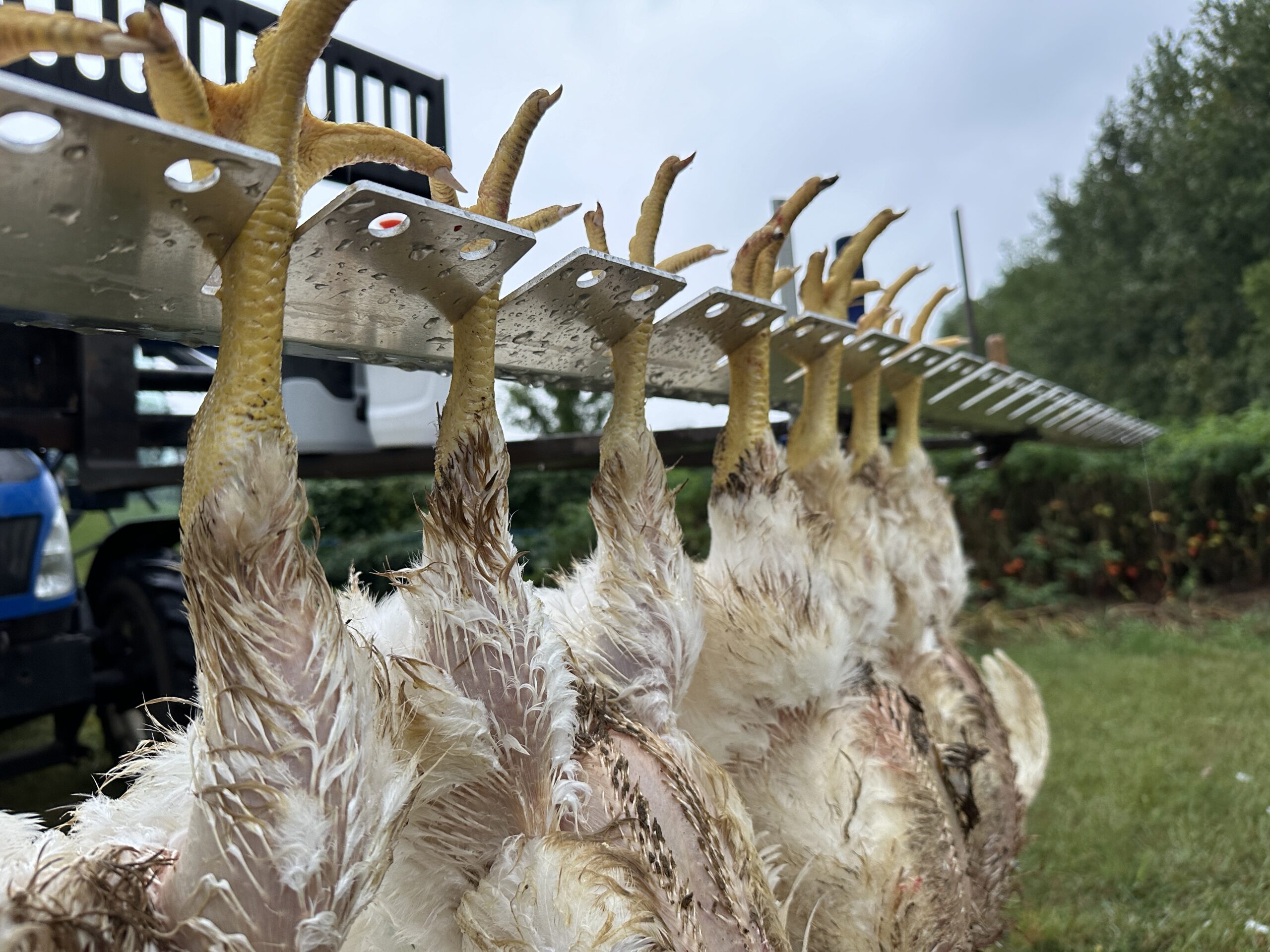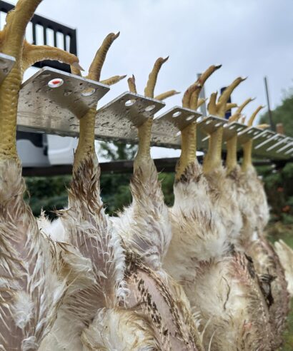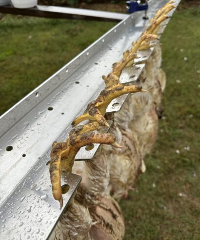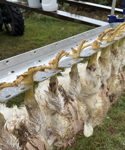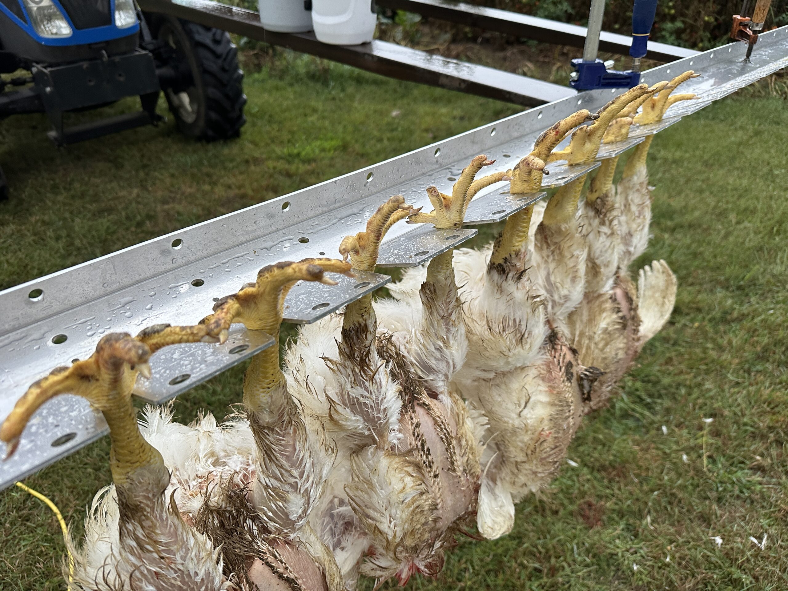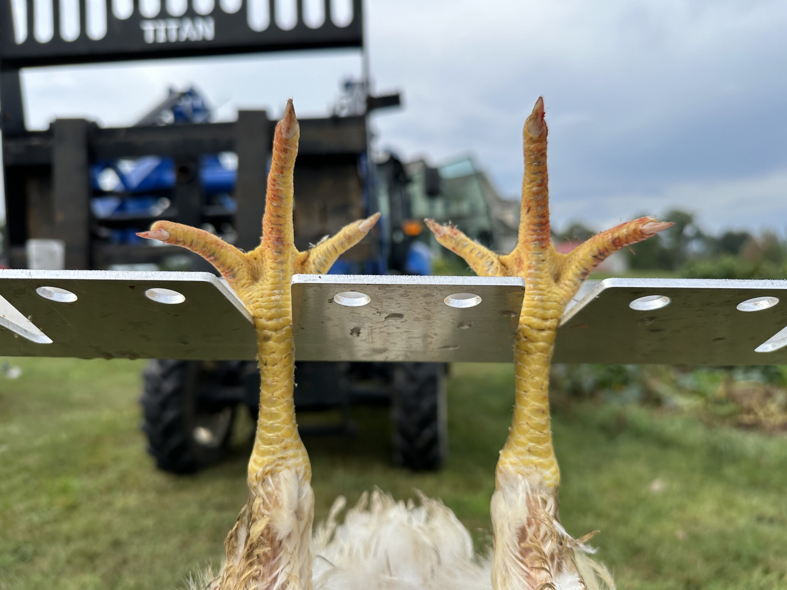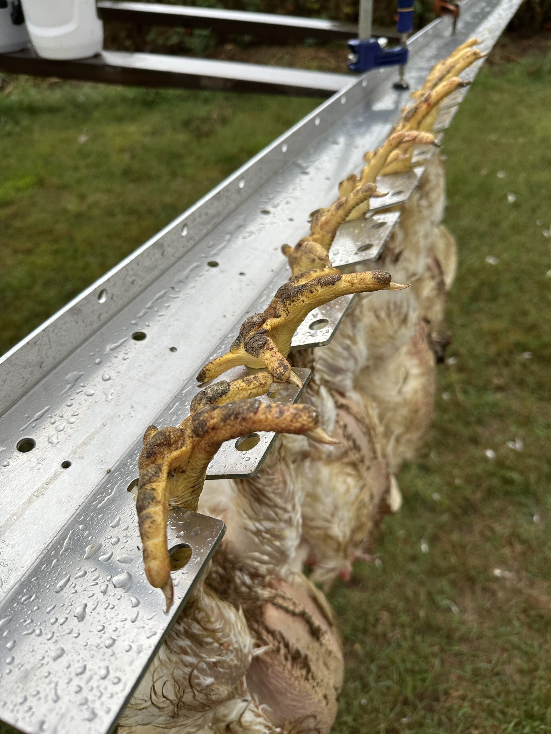 Tired of your chickens flopping on the ground during processing? This extremely simple to use rack is the easiest way to hang your meat chickens. Our innovative angled “V” profile securely holds both large and small chickens. At 4′ in length this rack will hold up to 6 chickens at a time.